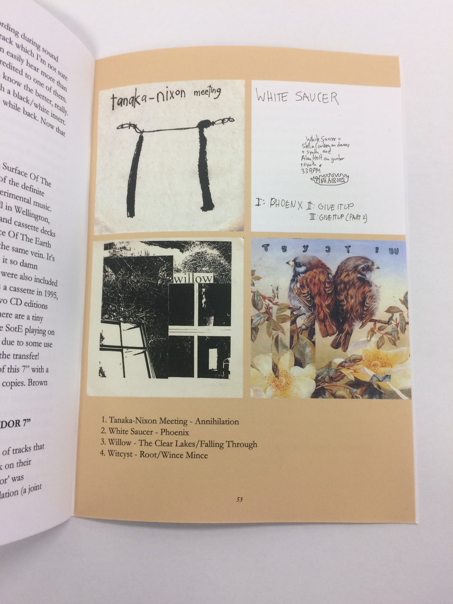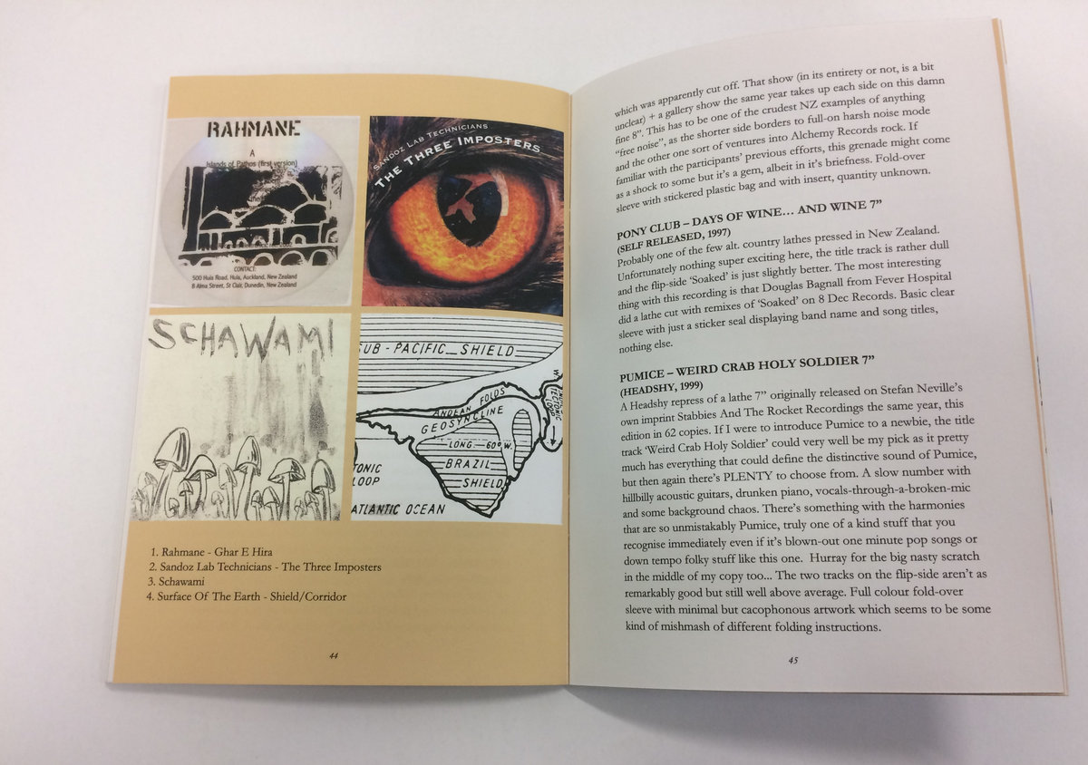 "Speaker Crackle In The Garden was a feature on New Zealand lathe cuts that ran in the last six issues of the Gothenburg fanzine Fördämning. This publication is a continuation of that, a review guide to 83 lathe cuts from New Zealand featuring releases from artists like Surface Of The Earth, Tanaka-Nixon Meeting, Armpit, Pumice, Birchville Cat Motel, Bruce Russell, The Drugs, New Zealand Guitar Orchestra, White Saucer, Sandoz Lab Technicians, Antony Milton, Oistraka, Omit plus many more, and labels like Headshy, High Tension House, Precious Metal, World Resources, CMR, Root Don Loonie For Cash, PseudoArcana, Celebrate Psi Phenomenon, Trinder, Crawlspace, Independent Woman Records etc. 60 text-heavy pages. Comes with a Root Don Loonie For Cash CD compiled by Clayton Noone featuring lathe tracks from The Strange Girls, Armpit, Claypipe, Pumice and more. Published by Discreet Music in an edition of 300 copies."